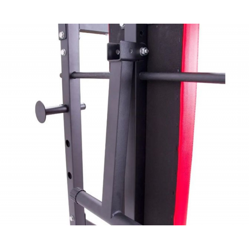 Конструкция inSPORTline X150 выполнена из высококачественной стали с устойчивым порошковым покрытием, что обеспечивает долговечность и надежность тренажера. Мягкие подлокотники и спинка с обивкой из синтетической кожи делают тренировки комфортными. Верхняя перекладина с диагональными ручками рассчитана на нагрузку до 120 кг, горизонтальная скамья выдерживает до 200 кг, а держатели для штанги – до 100 кг.