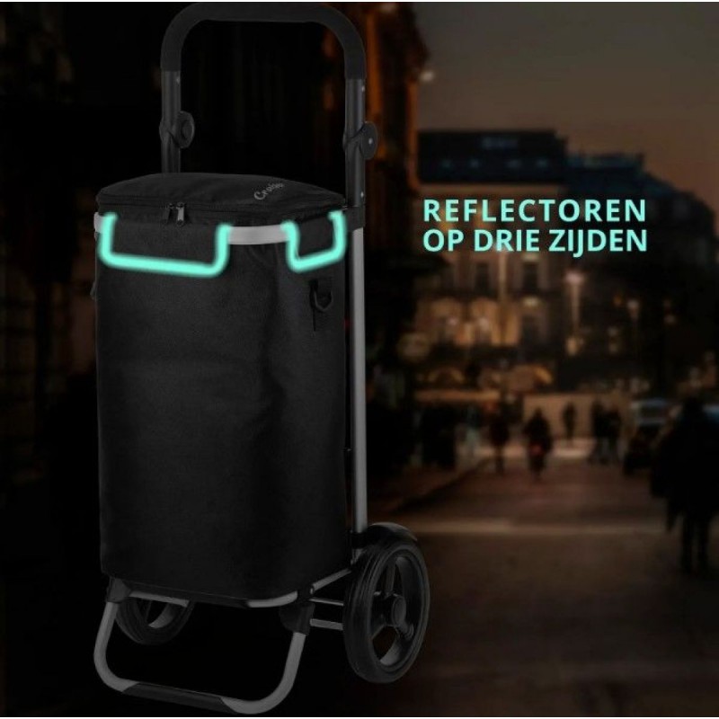 ShoppingCruiser Allround Black — это отличное решение для активных людей, которые любят порядок и комфорт. Сумка крепится к алюминиевой раме в трёх точках с помощью липучек, обеспечивая надёжность и устойчивость. Благодаря лёгкой складной конструкции тележку можно легко хранить дома или перевозить в автомобиле. Колёса диаметром 20 см обеспечивают мягкое и бесшумное движение по любой поверхности — асфальту, плитке или гравию.