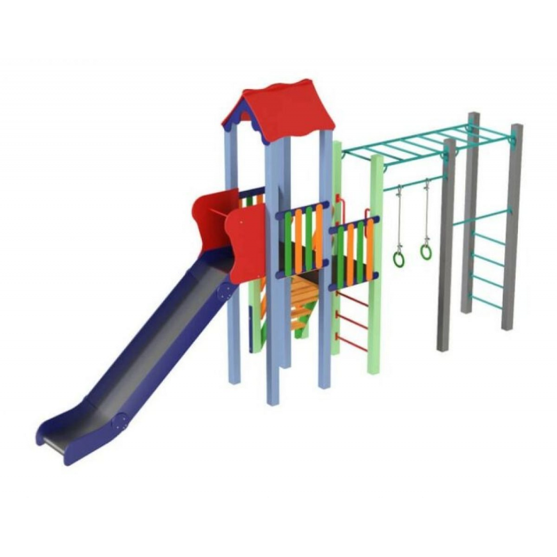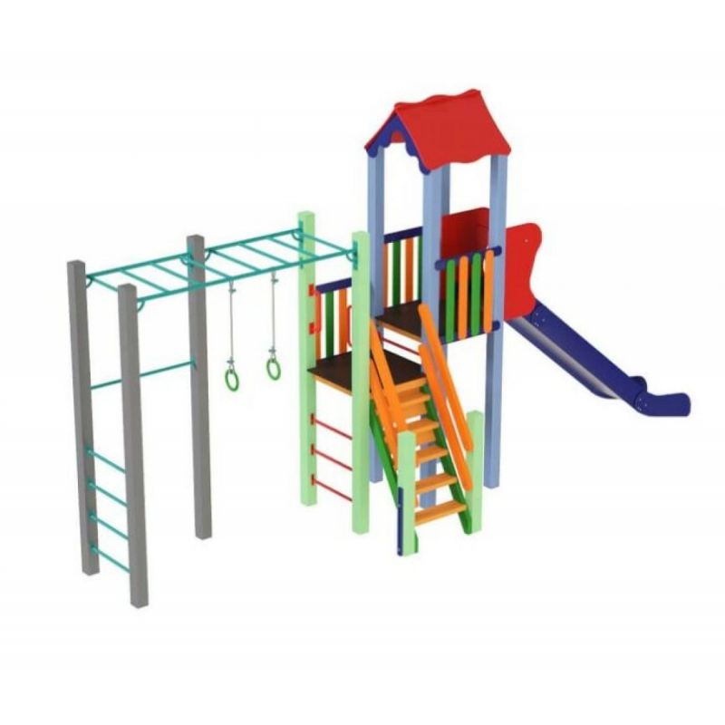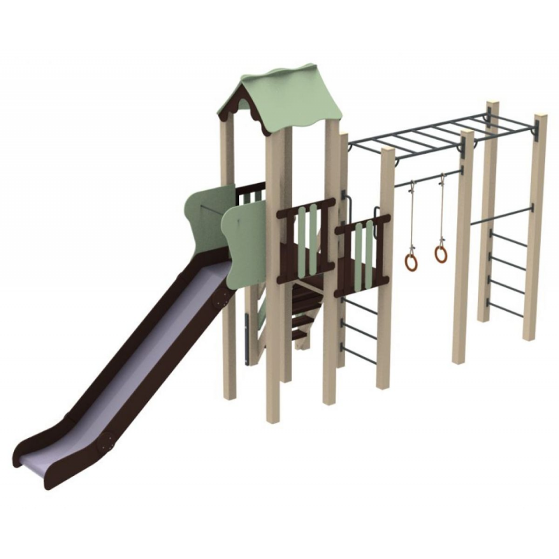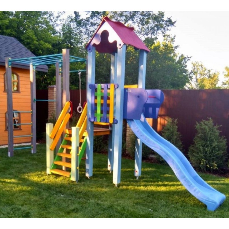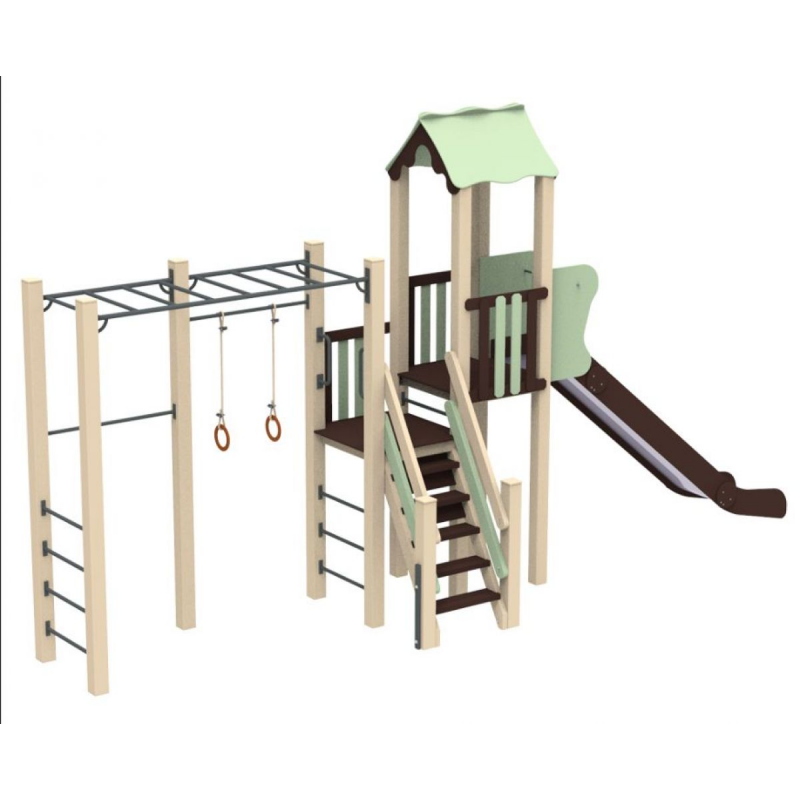 - Комплектация: платформа и башня, рукоход, брусья, детская горка