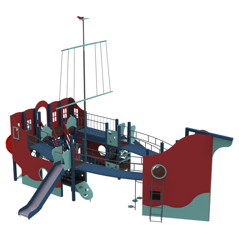 Конструкція у вигляді корабля з різноманітними містками переходами, стінками для скелелазіння, лазалки, різноманітні сходи та дитячі елементи, металева гірка, пластикова гірка-спіраль.