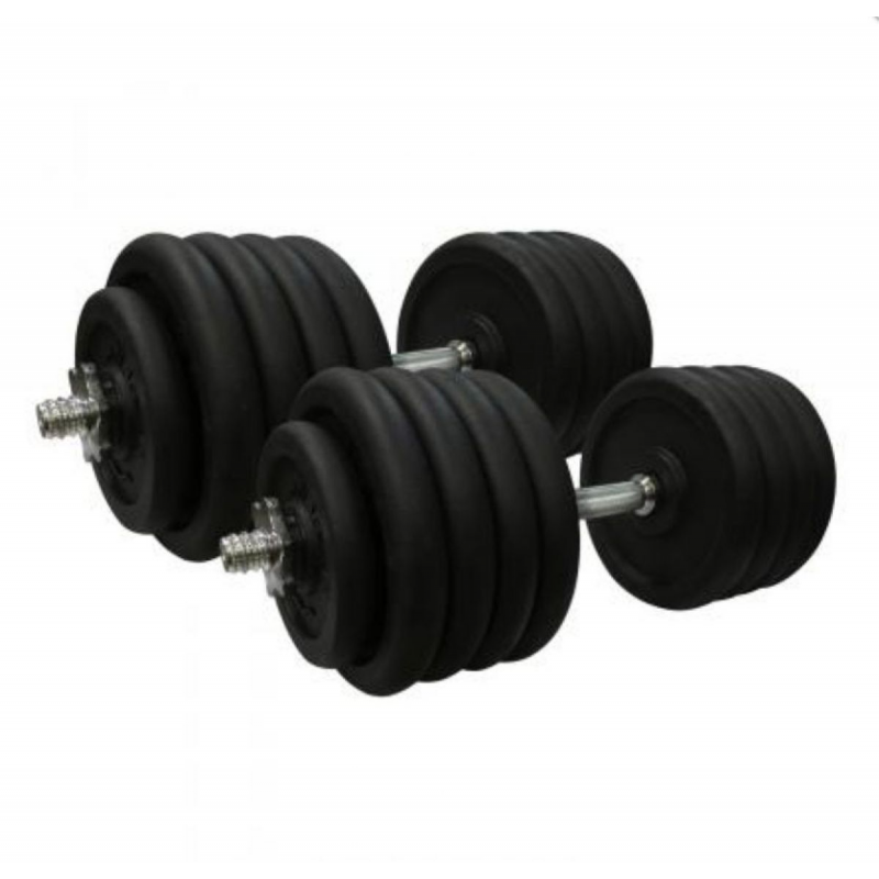 - Комплектация: 2 грифа (длина 50 см), 2 гайки, 16 дисков по 5 кг, 4 диска по 2 кг