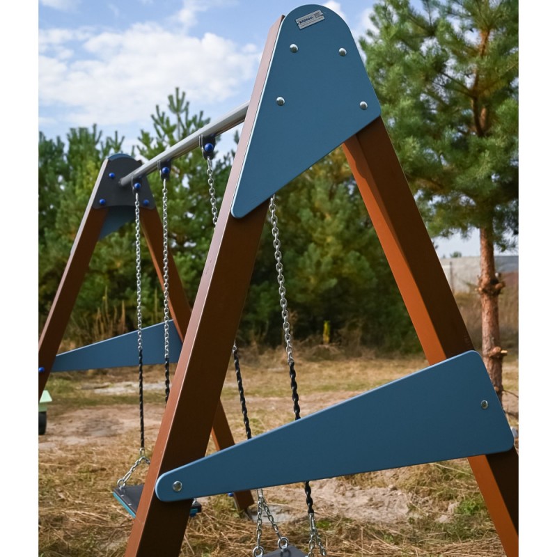 Элемент детского оборудования для детских площадок. Двойная детская качель на деревянных стойках.