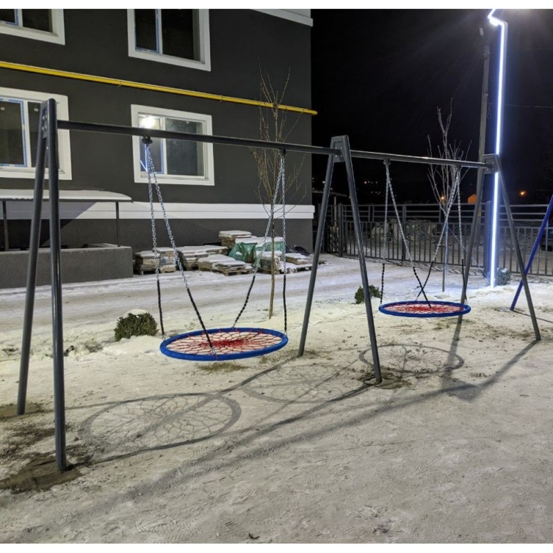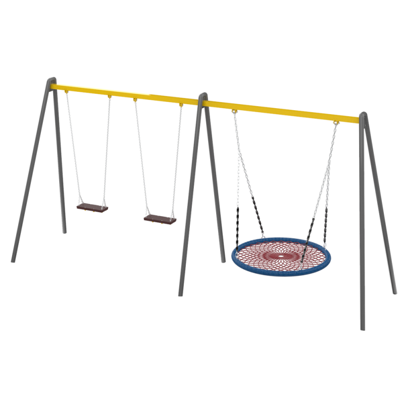 Элемент детского оборудования для детских площадок. Тройная детская качель на металлических стойках в компленкте поставки сиденье Аист и две сидушки ADULT.