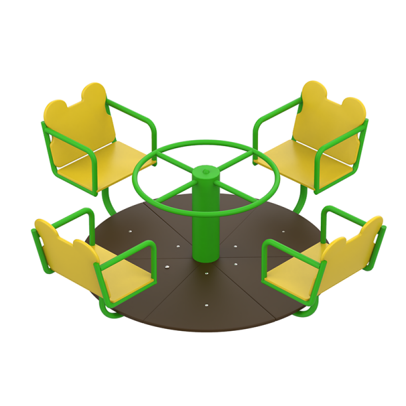 Карусель Кватро KIDIGO — це сучасне ігрове обладнання для дитячих майданчиків, яке поєднує яскравий дизайн, функціональність та безпеку. Ця карусель має чотири комфортні сидіння зі спинками, оформленими у вигляді миловидних вушок, що робить її особливо привабливою для дітей різного віку. Центральний руль (кермо) додає елемент інтерактивності, дозволяючи малюкам самостійно керувати рухом каруселі, розвиваючи координацію, моторику та соціальні навички.