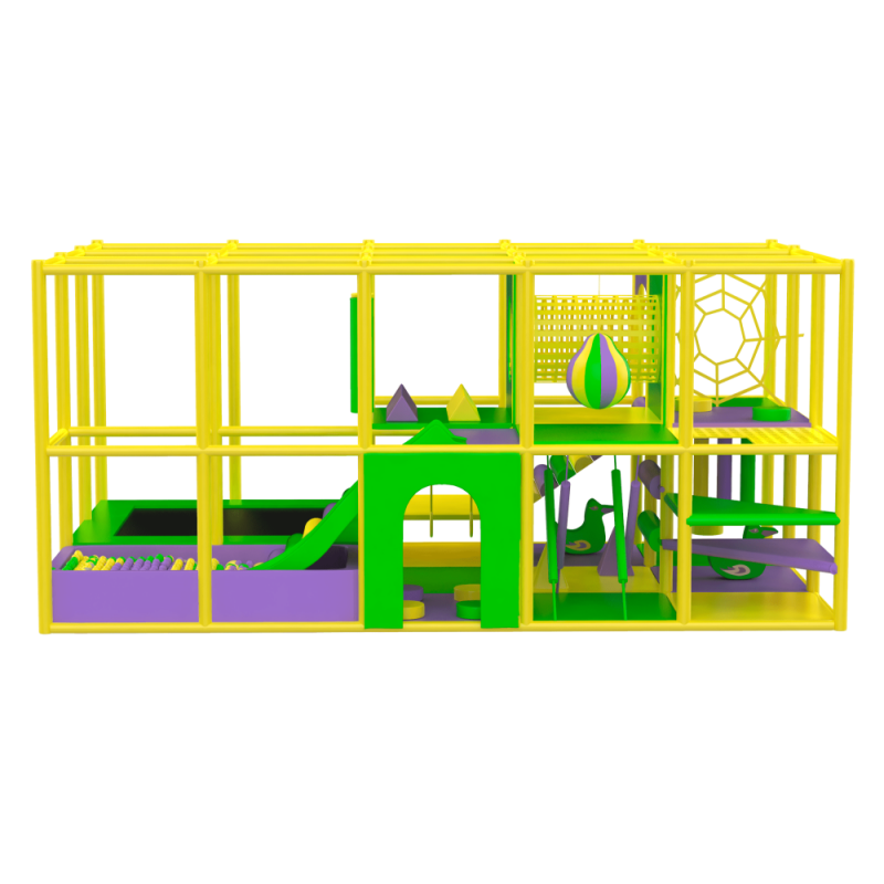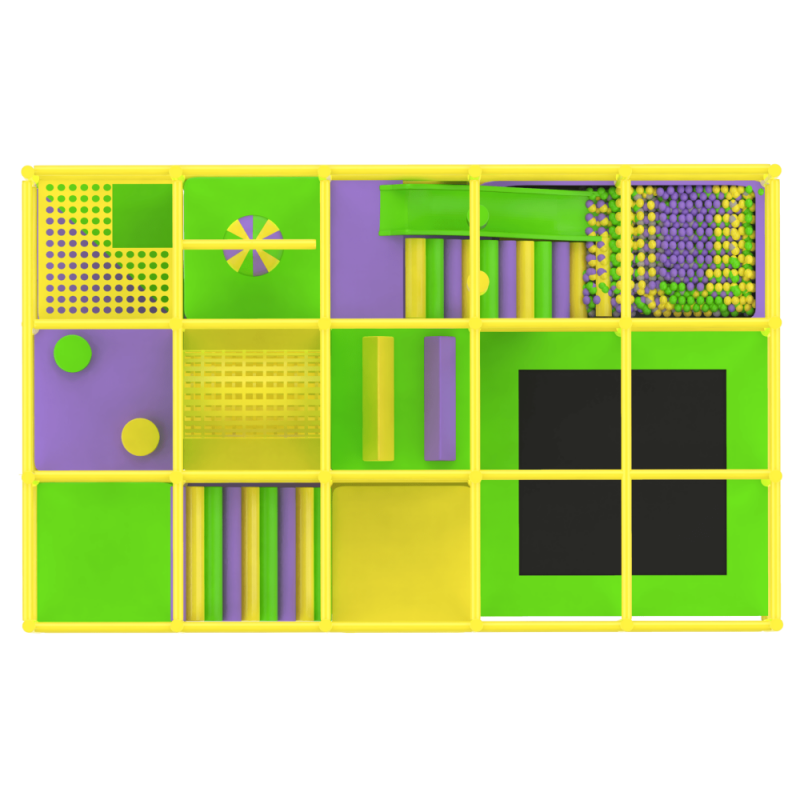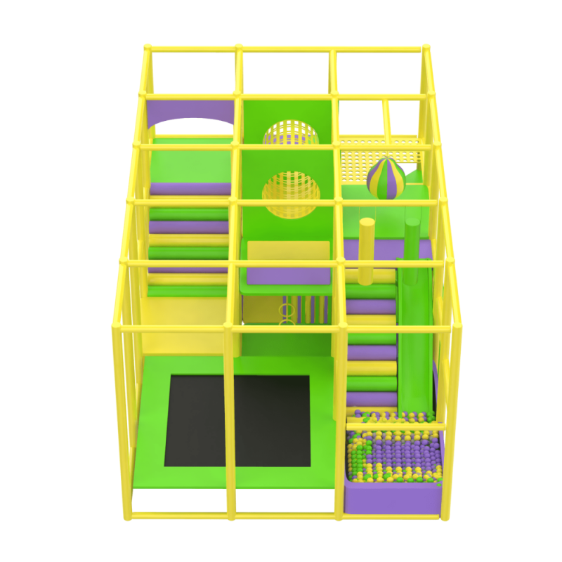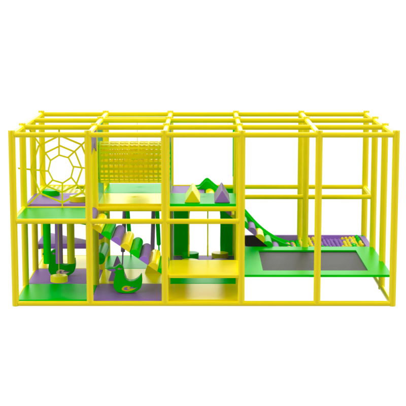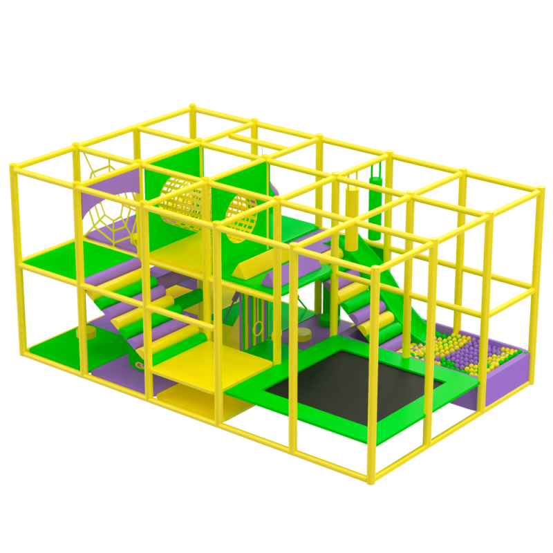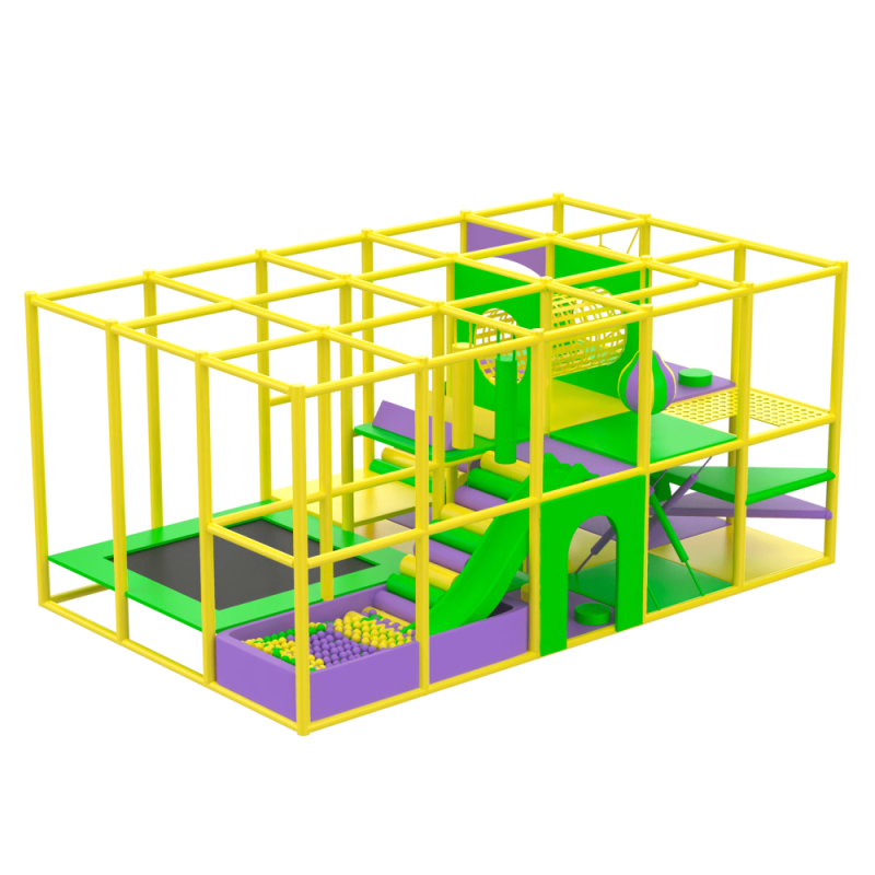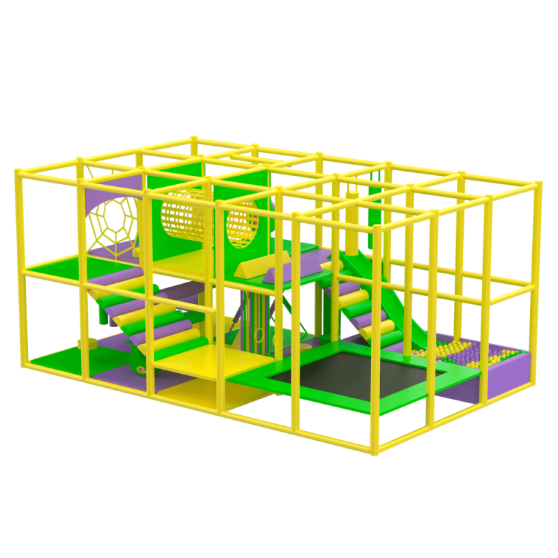 Двохповерховий лабіринт з подвійними м'якими сходами-спусками, пластиковою гіркою, тунелем, батутним комплексом, сухим басейном та ігровими елементами в середині.