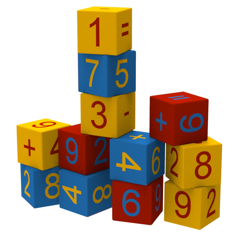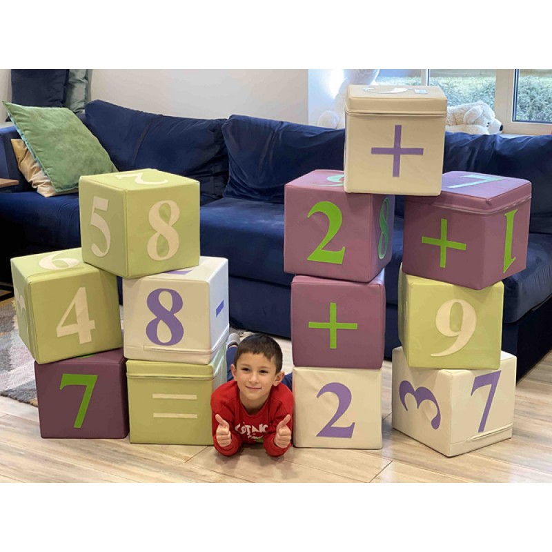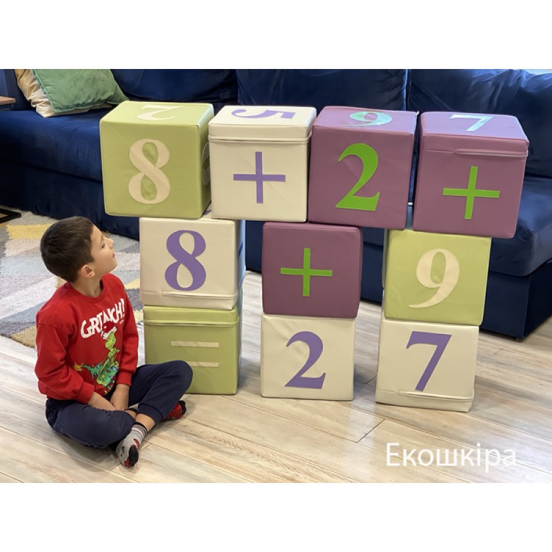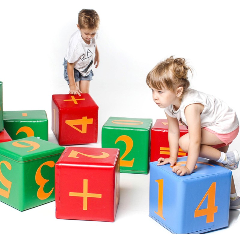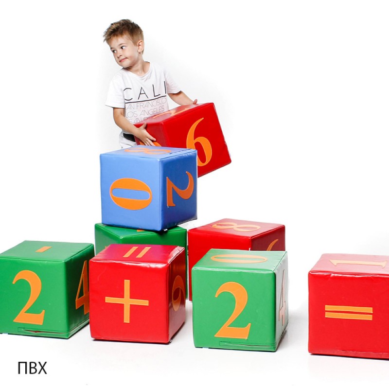 Набор состоит из 12 кубиков, размером 0,3м*0,3м*0,3м, на сторонах кубика размещены 72 цифры.