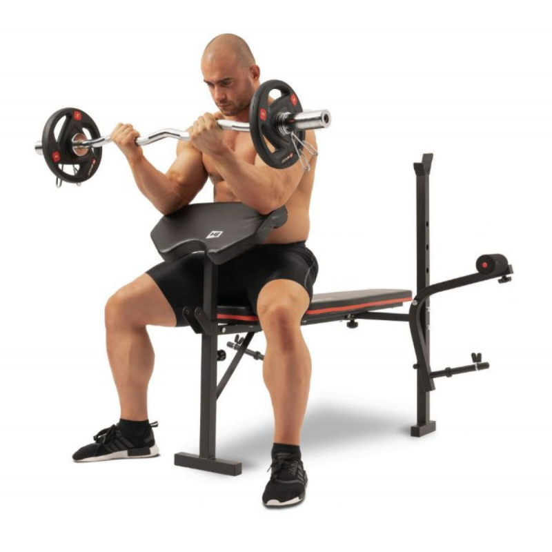 Свободные веса — это база силового тренинга, и этот набор раскрывает ее на 100%. Прямой гриф подходит для жима лежа, становой тяги, наклонов и выпадов, а W-образный гриф удобен для бицепса и трицепса: изогнутая форма помогает держать кисти естественно и снижает нагрузку на суставы. Гантельные грифы добавляют вариативности — можно делать жимы гантелей, разводки, тяги, изоляцию на плечи и руки. Скамья HS-1055 расширяет диапазон упражнений за счет парты Скотта и жима ногами, поэтому тренировки получаются разнообразными и действительно эффективными.