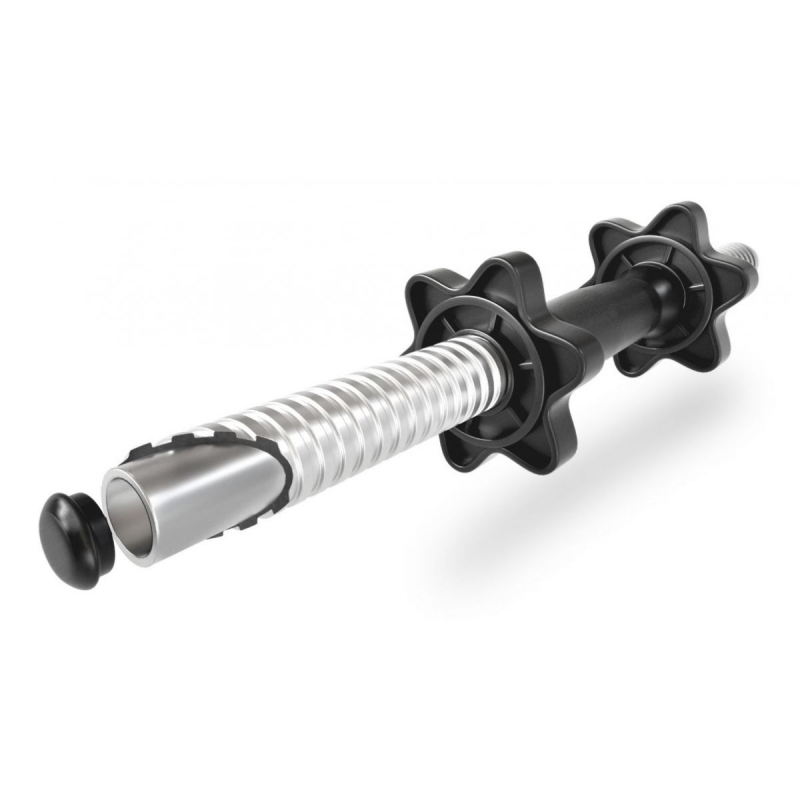 Параметры гантельного грифа: общая длина 45 см; между блоками 10 см; часть для дисков 2×16 см; вес 0,75 кг; диаметр 30 мм; максимальная нагрузка 60 кг.