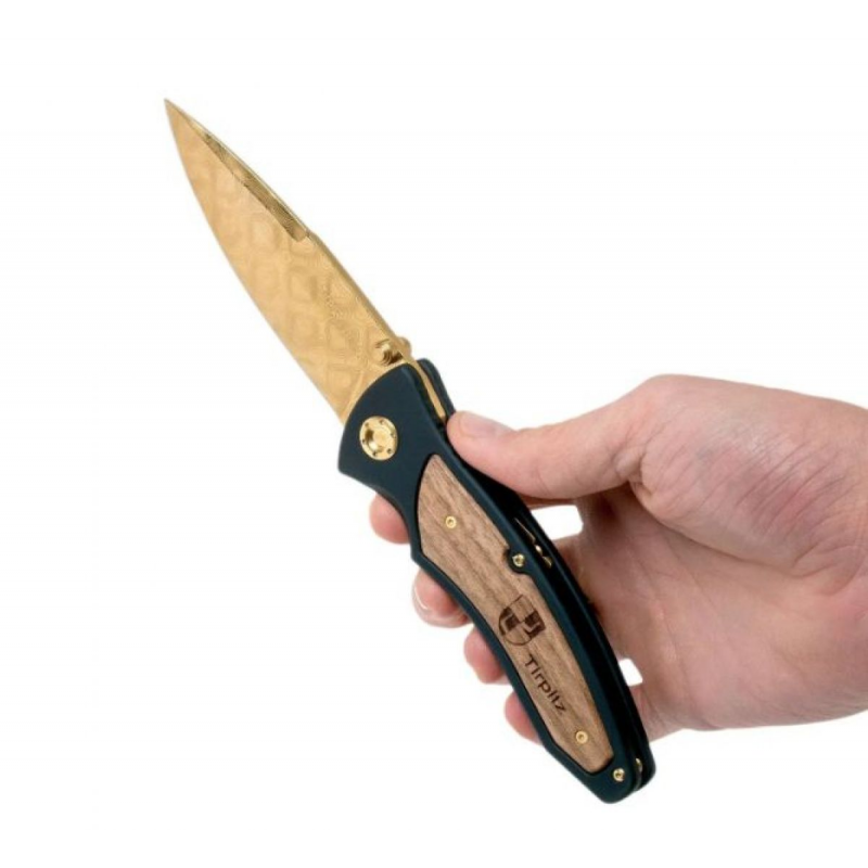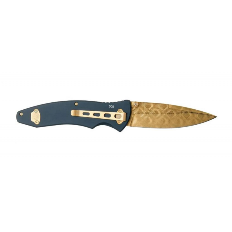 Рукоять изготовлена из алюминиево-магниевого сплава с добавлением кремния, благодаря чему конструкция получается легкой и одновременно прочной. Дополняют дизайн ореховые обкладки, которые придают ножу благородный внешний вид и приятное ощущение в руке. В варианте Gold модель смотрится особенно эффектно, подчеркивая элитарность ножа и его коллекционную ценность.