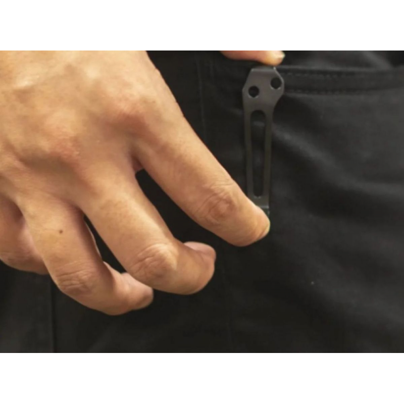 В открытом состоянии клинок фиксируется замком типа frame lock. Этот механизм отличается простотой конструкции, высокой надежностью и устойчивостью к нагрузкам. Он предотвращает самопроизвольное складывание ножа и обеспечивает дополнительную безопасность при работе. Клипса для глубокого ношения надежно удерживает нож в кармане, делая его практически незаметным.
