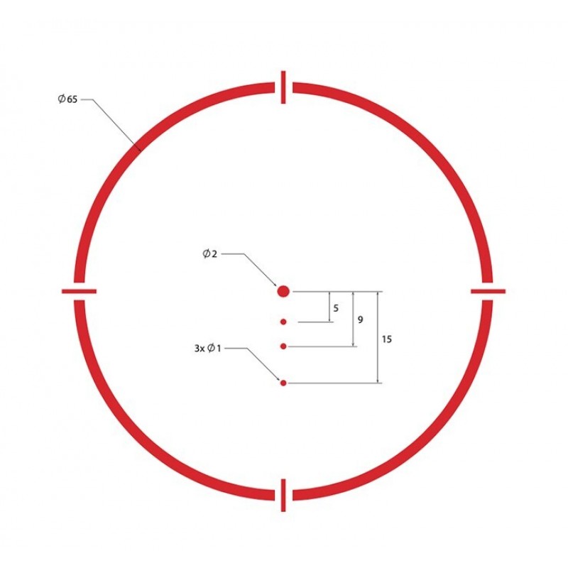 - Пользователи могут выбрать один из 4 различных вариантов встроенной сетки (точка 2 МОА, круг 65 МОА с точкой в центре 2 МОА, точка 2 МОА с 3 точками одна под другой размером 1 МОА, круг 65 МОА с точкой 2 МОА и 3 точками одна под другой размером 1 МОА). Сетка переключается одновременным зажатием 2-ух кнопок переключения яркости подсветки на 3 секунды. В вариантах сетки с 4 точками: вторая точка размером 1 МОА, расположенная под центральной точкой на расстоянии 5 МОА, используется для прицеливания по целям на дистанции 350 м, третяя точка размером 1 МОА, расположенная на расстоянии 9 МОА от центра, предназначена на дистанцию 500 м, четвёртая точка размером 1 МОА, расположенная 15 МОА от центра, предназначена для целей на дистанции 675-700 м.