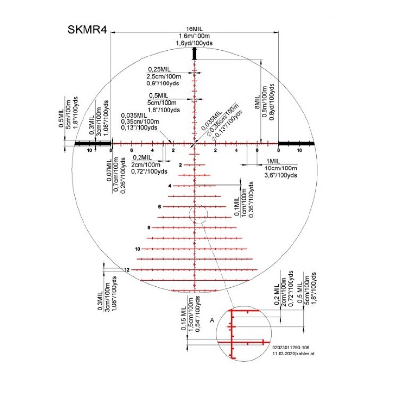 - Количество горизонтальных полос увеличено по сравнению с SKMR3 с 12 до 15 для увеличения дальности стрельбы. Расстояние между горизонтальными полосками маркеров поддерживается с шагом 0,5 MIL. Метки для поправок на ветер на горизонтальных полосах теперь сплошные, а не полые для лучшей видимости.