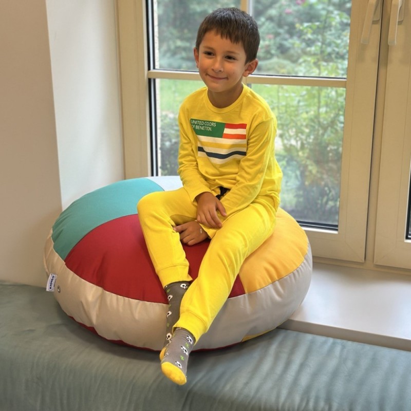 Обтягнутий дитячий пуф Острів Kidigo м'якою приємною на дотик ПВХ тканиною, яка до того ж легко миється, наповнений полістироловими кульками.