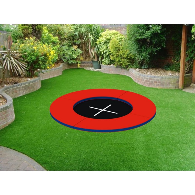 Батут встановлюється в землю, тому його поверхня знаходиться на одному рівні з ділянкою. Така конструкція виключає необхідність у захисній сітці та мінімізує ризик падіння з висоти. Завдяки цьому його можна вільно розміщувати у будь-якому дворі, не порушуючи гармонію ландшафту та зберігаючи максимальну естетичність.
