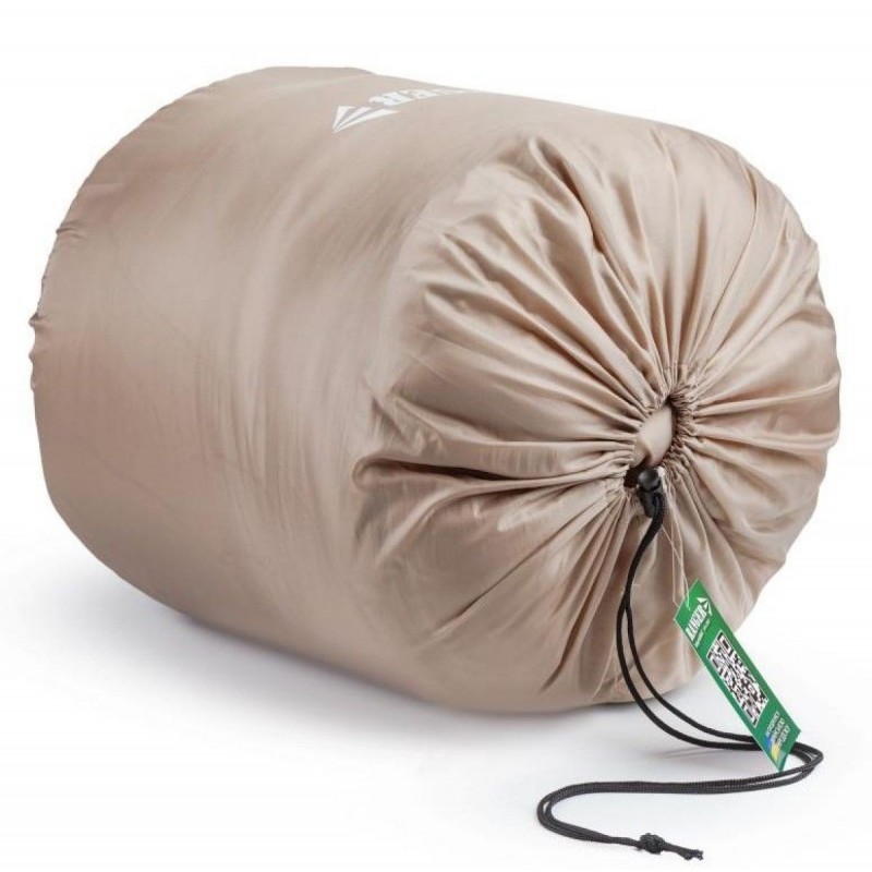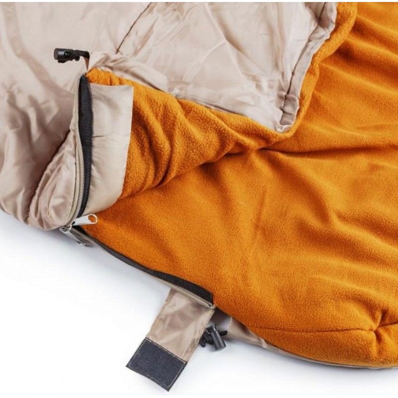 Спальний мішок товщиною 2,5 см розрахований на осінньо-зимовий період та температуру до -10°C. Для підвищення комфорту передбачена ортопедична вставка. Додаткова подушка, яку можна зняти, робить сон ще приємнішим. Мішок відкривається з обох боків, що спрощує користування.