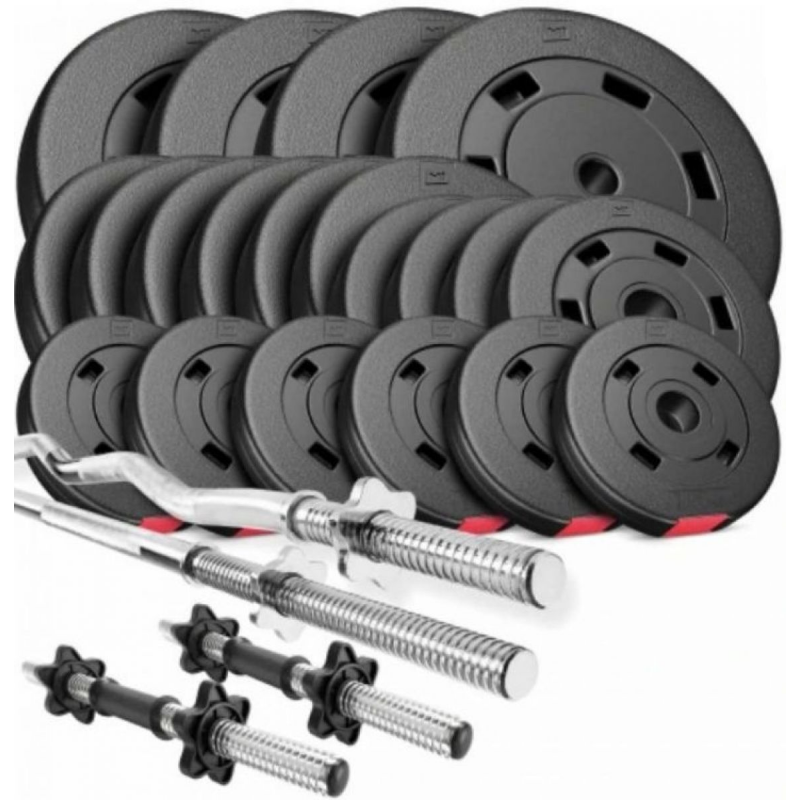 | Комплектация | Гриф прямий - 1 шт, гриф W-подібний - 1 шт, гриф 45 см - 2 шт, диски 10 кг - 4 шт, диски 5 кг - 6 шт, диски 2,5 кг - 4 шт, диски 1,25 кг - 6 шт, гайки Вейдера - 8 шт |