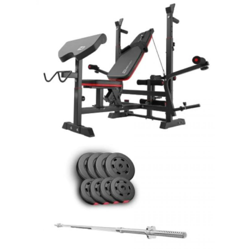 Набір призначений для силових тренувань із вільними вагами. З його допомогою можна опрацьовувати м'язи грудей, плечей, рук, спини, преса, ніг та сідниць. Лава HS-1075 Pro суттєво розширює спектр вправ, дозволяючи виконувати жими, базові силові елементи та додаткові ізолюючі вправи. Штанга з універсальним діаметром грифа забезпечує комфорт та безпеку під час занять.
