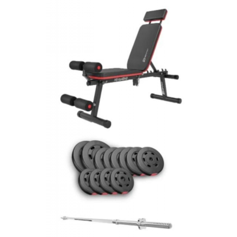Комплект розрахований на тренування з вільними вагами та дозволяє опрацьовувати всі основні групи м'язів: груди, спину, плечі, руки, прес та ноги. Лава HS-2040 HB оснащена стійками для штанги, партою Скотта, поворотними важелями та фіксатором для ніг, що значно розширює тренувальні можливості та робить заняття різноманітнішими та ефективнішими.