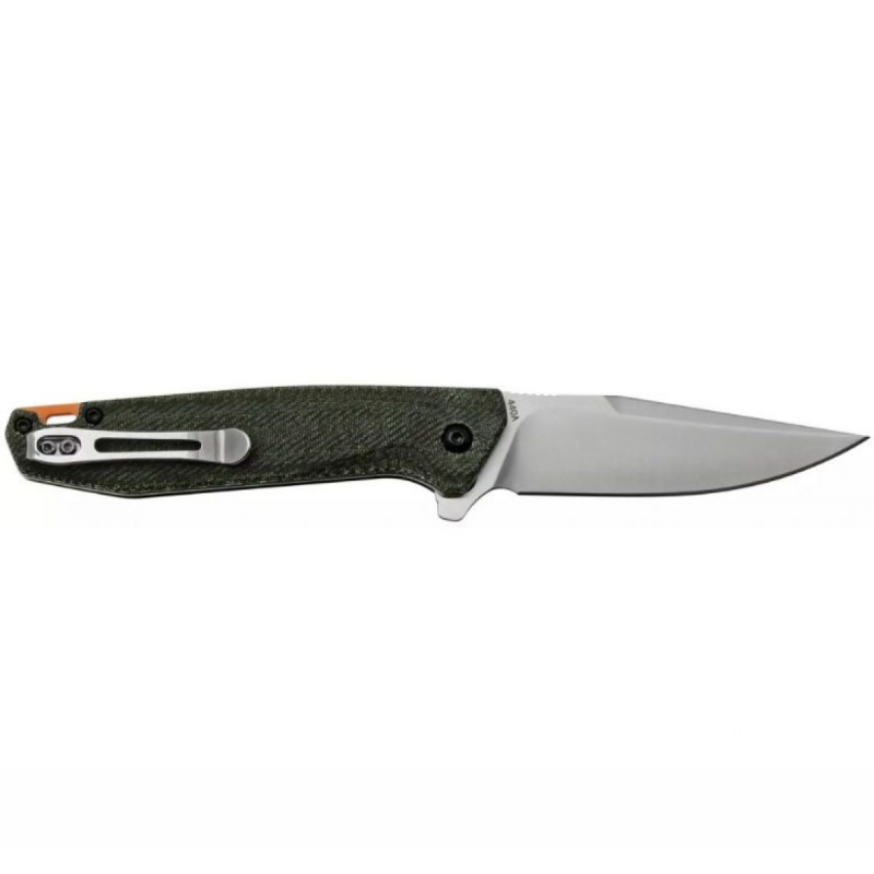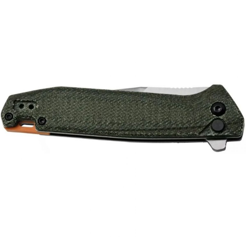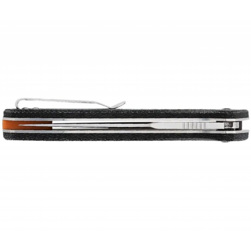 Додаткову міцність конструкції надає помаранчевий бекспейсер із G10. Він не тільки посилює рукоятку, а й виконує функцію отвору для темляка, дозволяючи адаптувати ніж під індивідуальні уподобання. Двосторонній затискач дає можливість глибокої посадки в кишені, роблячи носіння максимально непомітним та зручним.