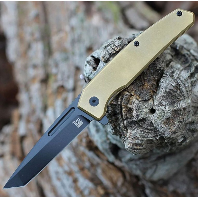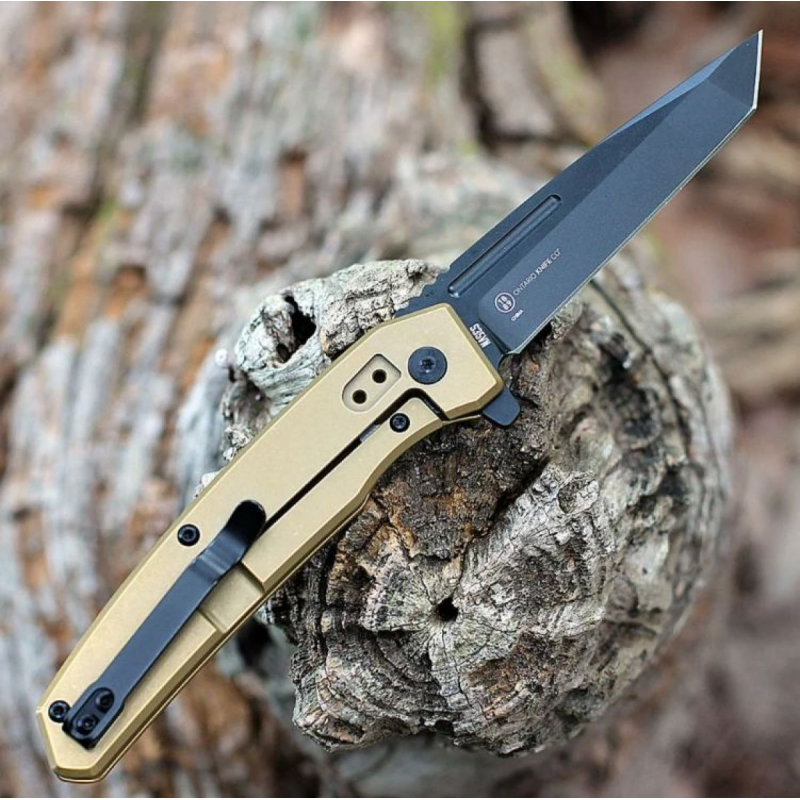 Ніж оснащений клинком із порошкової сталі марки S35VN, яка вважається однією з найкращих для кишенькових ножів завдяки високій зносостійкості, відмінному утриманню гостроти та стійкості до корозії. Рукоятка виконана з анодованого титану із золотавим відтінком, що забезпечує не лише легкість та міцність, але й стильний зовнішній вигляд. Механізм відкривання плавний і надійний, а доладна конструкція робить ніж компактним і зручним для носіння в кишені.