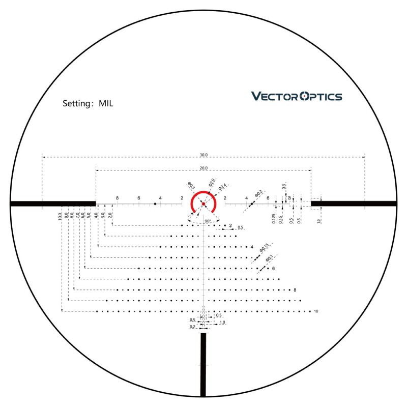Диаметр труби прицілу -30 мм, друга фокальна площина, мінімальна кратність 1x, що дозволяє використати два розплющені очі для стрільби.