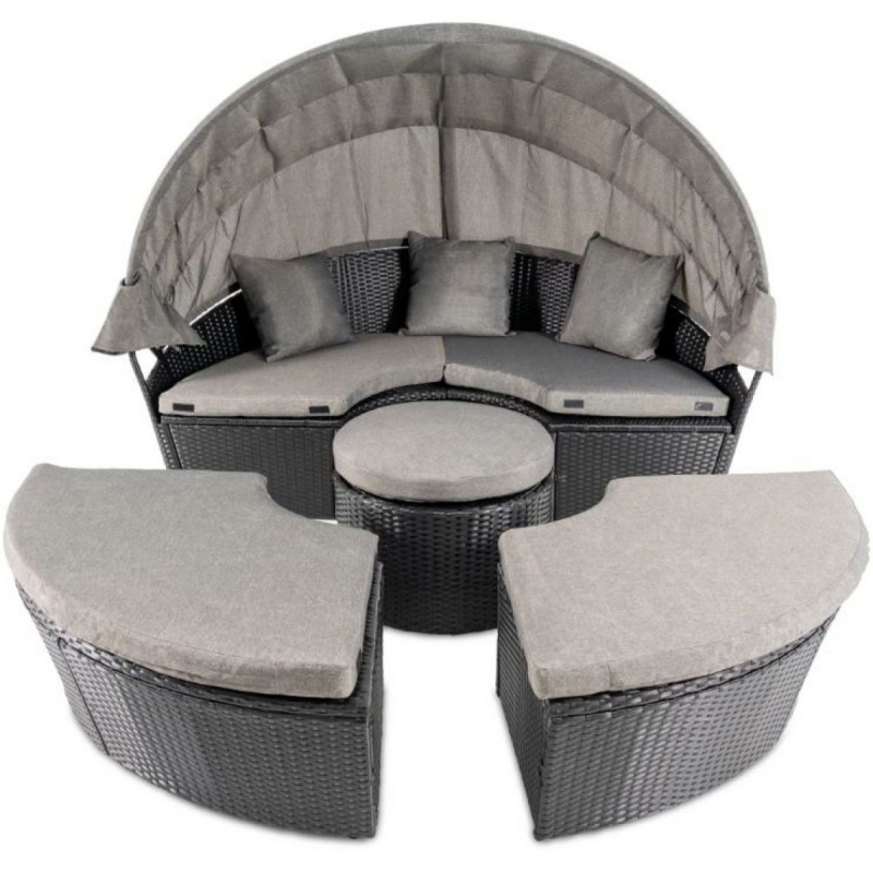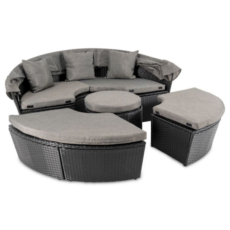 Набір складається з чотирьох окремих елементів: просторого дивана із захисним складним козирком, двох зручних пуфів та круглого столика в центрі. Завдяки унікальній системі трансформації ви можете змінювати конфігурацію: