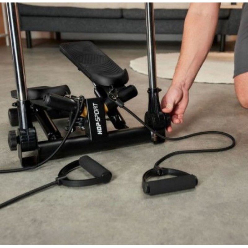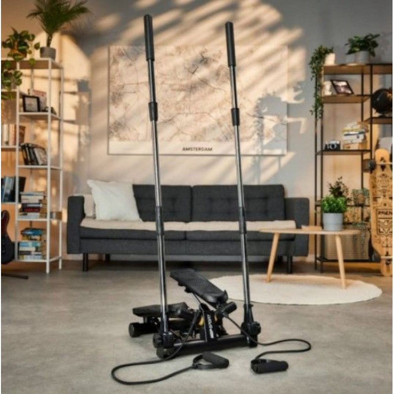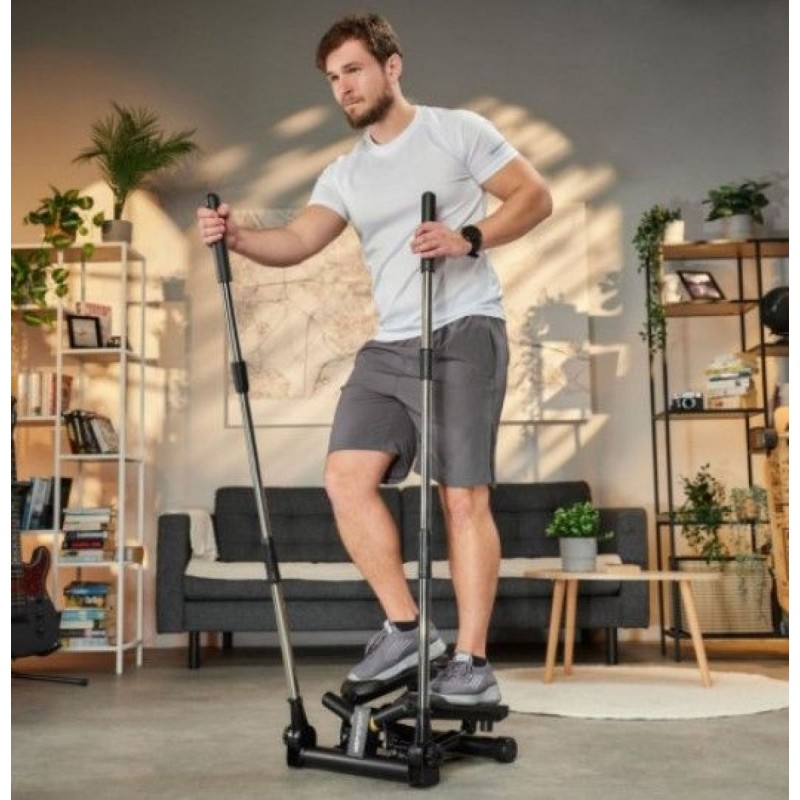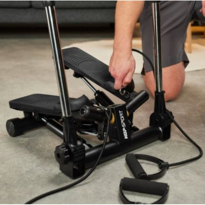 Міністепер Hop-Sport HS-050S Norg чорний — це сучасний компактний кардіотренажер для домашніх тренувань, який дозволяє підтримувати форму, зміцнювати м’язи та покращувати загальне самопочуття без необхідності відвідувати спортзал. Модель поєднує класичний принцип степ-тренувань із ручками для скандинавської ходьби та знімними еспандерами, завдяки чому ви отримуєте повноцінне навантаження на все тіло в одному пристрої.