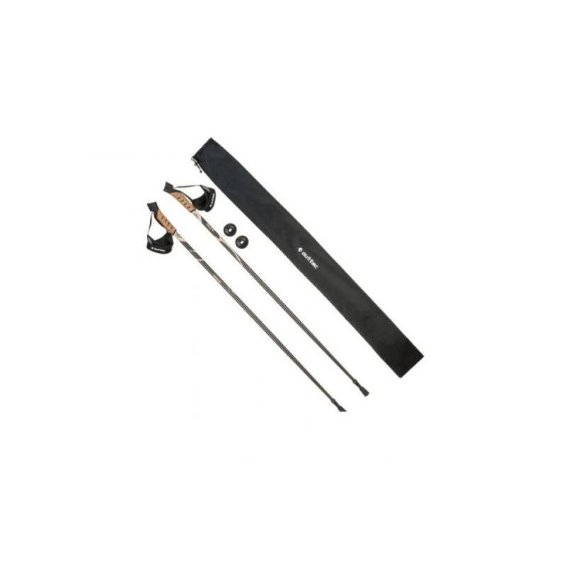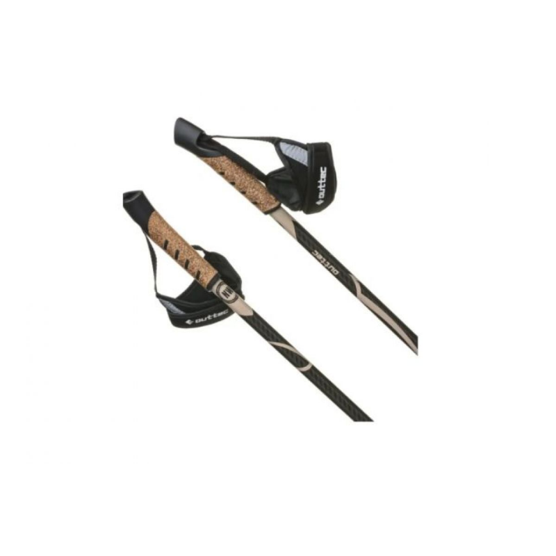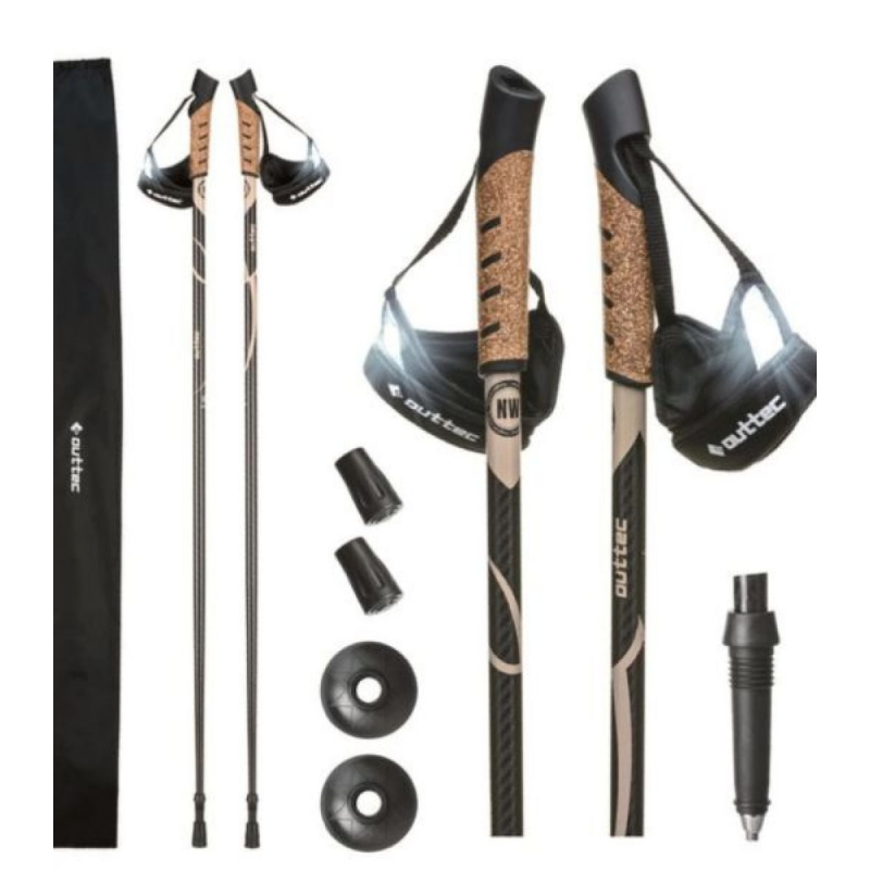 Палиці Outtec виготовлені з карбону та алюмінію з додаванням скловолокна, що забезпечує ідеальне поєднання міцності та легкості. Ергономічна коркова рукоятка з відбивачем знижує навантаження на зап'ястя і запобігає ковзанню навіть при тривалому використанні. Світловідбивна стрічка на рукоятці підвищує безпеку під час прогулянок у сутінках або в умовах низької видимості. Типи палиць виготовлені із загартованої сталі, вони стійкі до стирання та надійно тримають зчеплення з будь-якою поверхнею. Система Anti-shock ефективно гасить удари, зменшуючи втому рук та плечового пояса.