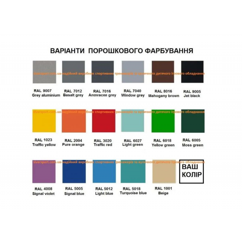 Металевий профіль забезпечує високу жорсткість конструкції, а порошкове покриття захищає поверхню від сколів, подряпин та корозії. Це особливо важливо при встановленні обладнання на відкритих спортивних майданчиках. Турнік зберігає міцність та естетичний зовнішній вигляд навіть при впливі вологи, перепадів температур та ультрафіолету.